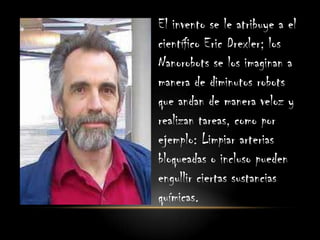 Este documento describe los nanorobots y su potencial aplicación en la medicina. Los nanorobots son diminutos robots a escala nanométrica que podrían limpiar arterias bloqueadas, eliminar células cancerígenas, reparar tejidos dañados, y detectar y tratar enfermedades en sus primeras etapas al flotar libremente en los vasos sanguíneos. La nanomedicina aplica la nanotecnología a la medicina utilizando nanorobots para interactuar con células sanguíneas y reparar tej