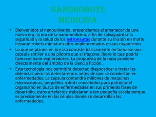 La NASA planea usar nanorobots para monitorear la salud de astronautas durante misiones a Marte. Estos nanorobots, ingeridos como una píldora, patrullarían el cuerpo para detectar enfermedades en sus primeras etapas y brindarían resultados a través de una pantalla. Asimismo, los nanorobots podrían usarse para tareas médicas como reparar tejidos, curar el cáncer o SIDA, y modificar el ADN.