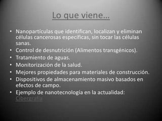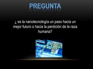 La nanotecnología es el estudio y manipulación de la materia a escala nanométrica. Ofrece beneficios como productos más pequeños y eficientes, pero también riesgos como la replicación descontrolada de máquinas a nivel molecular. Es importante que los avances científicos mejoren la vida humana sin poner en peligro la dignidad de las personas.