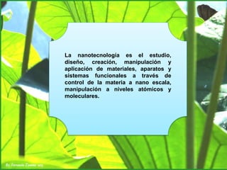 La nanotecnología estudia y aplica materiales a nano escala, con aplicaciones en la alimentación, salud, agricultura y medio ambiente, como la detección de patógenos y la purificación de agua. Aunque presenta oportunidades significativas para mejorar la eficiencia y sostenibilidad, también plantea riesgos serios, como cambios sociales, carrera armamentista y daño ambiental. Su revolución podría tener un impacto profundo en diversas áreas de la vida cotidiana, haciendo necesario su comprensión y gestión adecuada.