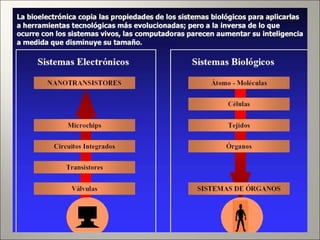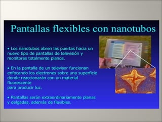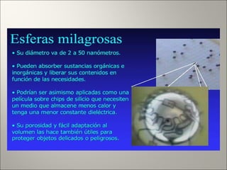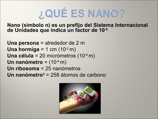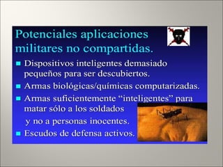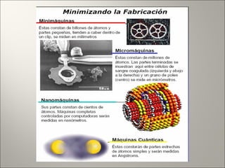 La nanotecnología involucra el control y manipulación de la materia a escala nanométrica entre 1-100 nanómetros. Esto permite reorganizar átomos y moléculas para fabricar nuevos materiales y máquinas. Algunas aplicaciones incluyen nanopartículas para detección temprana de enfermedades, nanotubos de carbono ultraresistentes, y en un futuro nanorobots podrían usarse para cirugía celular guiada. Sin embargo, su rápido desarrollo también plantea riesgos como su uso indeb
