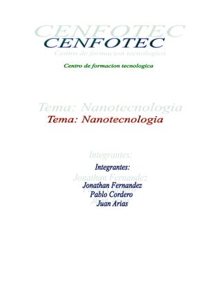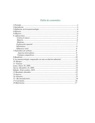 Este documento presenta una introducción a la nanotecnología, definiéndola, describiendo su historia y objetivos. Explora aplicaciones en áreas como la medicina, el deporte, la exploración espacial e informática. También discute nanotubos de carbono, beneficios potenciales y riesgos. Incluye secciones sobre noticias recientes, resultados obtenidos y una conclusión sobre el futuro prometedor pero también los desafíos de regular la nanotecnología.