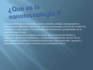 La nanotecnología es el estudio y manipulación de la materia a escala nanométrica para crear materiales y sistemas con propiedades únicas. Ofrece ventajas como la producción eficiente de agua, energía y computadoras, pero también plantea desventajas como cambios en la economía y el medio ambiente. En medicina, permitirá herramientas de diagnóstico y tratamiento más baratas y efectivas.