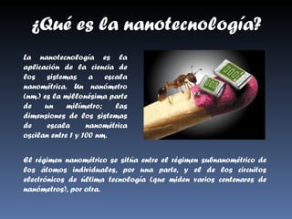 La nanotecnología es la aplicación de la ciencia a escala nanométrica, entre 1 y 100 nm. Existen dos tipos principales: la reducción de tamaño (top-down) y el autoensamblado (bottom-up). Los objetivos de la nanotecnología son colocar átomos en su lugar, lograr estructuras consistentes con las leyes físicas y químicas, y fabricar productos de forma económica. Richard Feynman es considerado el padre de la nanociencia y propuso en 1959 fabricar productos reordenando