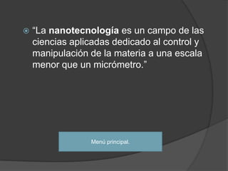 Este documento presenta una introducción a la nanotecnología. Define la nanotecnología como el estudio y manipulación de la materia a escala nanométrica para explotar nuevas propiedades. Explica que Richard Feynman fue pionero en este campo y que la nanotecnología tiene el potencial de resolver problemas ambientales y de salud. Finalmente, destaca algunas de las aplicaciones más prometedoras como la energía, agricultura y medicina, y que países en desarrollo están invirtiendo en investigación nanotecnológ