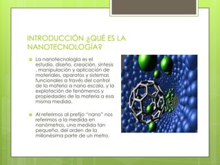 El documento describe cómo la nanotecnología puede combatir enfermedades a través de biosensores para diagnosticar cáncer, nanopartículas que eliminan toxinas bacterianas, nanopartículas acopladas a tratamientos para superar la barrera hematoencefálica, y nanotubos de carbono para la liberación controlada de fármacos y quemar células cancerosas mediante radiación infrarroja. La nanotecnología tiene el potencial de revolucionar el tratamiento de enfermedades.