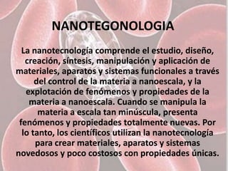 La nanotecnología involucra el estudio y manipulación de la materia a escala nanométrica para crear nuevos materiales y sistemas con propiedades únicas. Richard Feynman fue pionero en este campo en 1959. La nanotecnología avanzada busca ingenierar sistemas a nivel molecular. Sus aplicaciones potenciales incluyen almacenamiento de energía, agricultura, medicina y procesamiento de alimentos.
