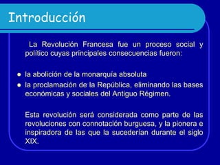 La Revolución Francesa abolió la monarquía absoluta y estableció la República, eliminando el Antiguo Régimen. Napoleón se convirtió en líder de Francia tras el golpe de Estado de 18 Brumario, coronándose emperador en 1804. Modernizó Francia pero sus guerras de conquista lo convirtieron en blanco del odio europeo, llevando a su derrota final en Waterloo en 1815.
