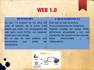 El documento describe la evolución de la web desde la web 1.0, estática y de solo lectura, hasta la web 5.0, que permite interacciones emocionales y personalizadas. Cada etapa presenta características definitorias y mejoras en la interacción, colaboración y capacidades de las tecnologías utilizadas. Se destaca la transición de una web estática a una más inteligente y sensible a las emociones del usuario.