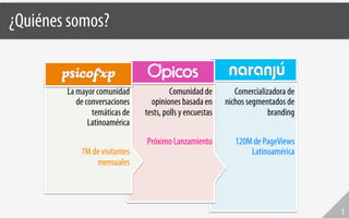 El documento presenta una plataforma de comunicación basada en encuestas y opiniones, posicionándose como la mayor comunidad de comercialización de branding en Latinoamérica, con 120 millones de pageviews y 7 millones de visitantes mensuales. Ofrece productos segmentados por nichos, generando contenido y permitiendo a las marcas interactuar con usuarios mediante pruebas y encuestas. Además, destaca casos de éxito en la implementación de formatos publicitarios y patrocinios con un alto impacto en la audiencia.