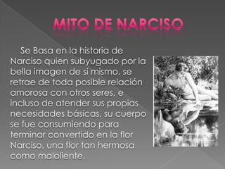 El documento presenta información sobre el narcisismo y la personalidad narcisista. Define el narcisismo como una forma de estructuración de la personalidad y una etapa del desarrollo humano donde el individuo dirige toda su energía a satisfacer sus propias necesidades. Explica que la personalidad narcisista se caracteriza por un sentido exagerado de importancia personal y falta de empatía, así como por la necesidad constante de admiración. Además, clasifica nueve tipos de personalidad narcisista y señala que los narcisistas tienden a ser más agresivos