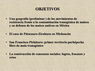 Este documento describe los esfuerzos de los agricultores en las cuencas de Pátzcuaro-Zirahuen, Michoacán, México para defender los maíces nativos frente a la contaminación transgénica. Se destaca el caso de San Francisco Pichátaro, que alberga una gran diversidad de maíces nativos y se declaró libre de maíz transgénico. Aunque se han logrado avances como la celebración anual de la Fiesta del Maíz, persisten desafíos como captar jóvenes agricultores, estable