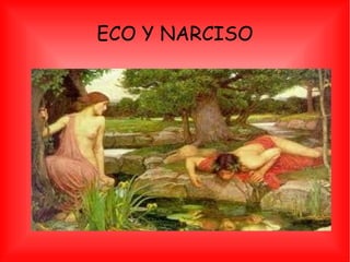 Eco era una ninfa que repitió las últimas palabras de Juno como castigo por ayudar a Júpiter en sus engaños. Eco se enamoró de Narciso pero él la rechazó. Al beber agua en un río, Narciso se enamoró de su propio reflejo y murió al no poder estar con él.