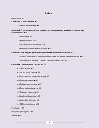 Este documento describe la evolución de los narcocorridos en México como una forma de expresión musical que narra las historias y hazañas de los narcotraficantes. Explica que los narcocorridos son una versión moderna de los corridos tradicionales mexicanos, y analiza el contexto social y cultural en el que surgió este género musical. También discute la censura de los narcocorridos y su popularidad a pesar de la controversia.
