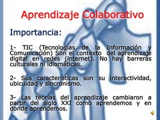Este documento describe el aprendizaje colaborativo y su relación con las tecnologías de la información y la comunicación (TIC). Explica que el aprendizaje colaborativo es un fenómeno social que ocurre a través del diálogo y la negociación. También destaca los elementos, características, ventajas y modelos de aprendizaje colaborativo, así como su relación con el constructivismo. Finalmente, señala cómo las TIC pueden apoyar el aprendizaje colaborativo facilitando la comunicación, el trabajo en