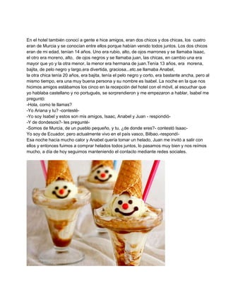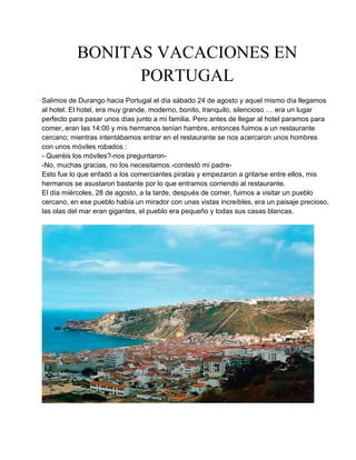 La familia de la autora viajó a Portugal de vacaciones y se hospedó en un hotel moderno y tranquilo cerca del mar. Mientras intentaban comer en un restaurante cercano, unos hombres trataron de venderles teléfonos robados. Más tarde, visitaron un pueblo con vistas al mar y olas gigantes. En el hotel, la autora conoció a otros jóvenes españoles y pasaron una noche compartiendo helados y conversando.