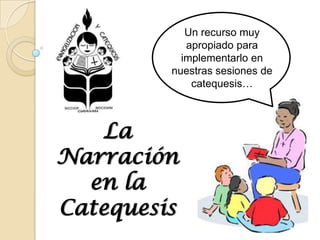 La narración es un recurso útil para la catequesis que implica contar historias sobre hechos reales o ficticios. Una narración contiene elementos como un narrador, personajes, acciones y una trama con un acontecimiento inicial, reacciones, acciones y una solución. Al construir una narración, es importante definir la acción, los personajes, la estructura de la historia y cómo se presentará la narración.