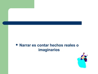 Este documento describe los elementos básicos de la narración, incluyendo la definición de narrar, los diferentes tipos de narración como la épica, la novela y el cuento, y los componentes clave de una narración como el narrador, la acción, los personajes y la estructura básica de inicio, nudo y desenlace.