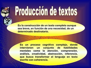 Este documento ofrece estrategias para la producción de textos. Explica que la producción de textos implica varias etapas como la planificación, textualización y revisión. También describe diferentes formas de producir textos como describir lo que se conoce, activar conocimientos nuevos o transmitir información. Finalmente, recomienda considerar aspectos lingüísticos, el contexto y la revisión al producir textos.