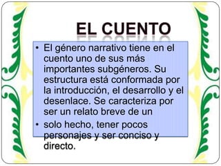 Este documento resume los principales géneros narrativos como el cuento, el mito, la fábula, las expresiones populares y la novela. Describe las características de cada uno, incluyendo sus elementos, antecedentes históricos y diferentes tipos. También explica conceptos como el folklor y cómo expresiones como las bombas, las adivinanzas y los refranes ilustran las tradiciones de un pueblo.