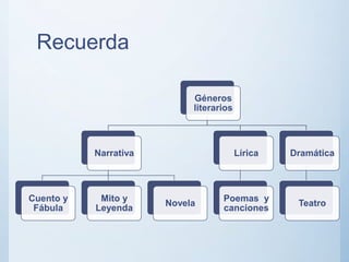 Este documento presenta diferentes géneros literarios narrativos. Explica que el cuento es una historia breve en prosa con inicio, nudo y desenlace. Los cuentos tradicionales se transmiten oralmente y pueden ser maravillosos, de animales o de fórmulas. La fábula también usa animales que actúan como personas y termina con una moraleja. Los mitos y leyendas son narraciones imaginarias del pasado que explican fenómenos naturales. La novela es una larga narración con personajes complejos en un contexto