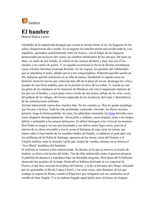 Este documento narra la situación de hambre extrema que enfrentan los conquistadores españoles mientras están sitiados por los indígenas en América del Sur. Describe cómo los españoles se han comido todo lo comestible, incluidos cuero, ratas y sabandijas. Un ballestero llamado Baitos culpa a los jefes españoles por su situación y planea comerse uno de los cadáveres colgados, pero es descubierto por cuatro jefes conversando cerca de una fogata. El hambre y el odio de B