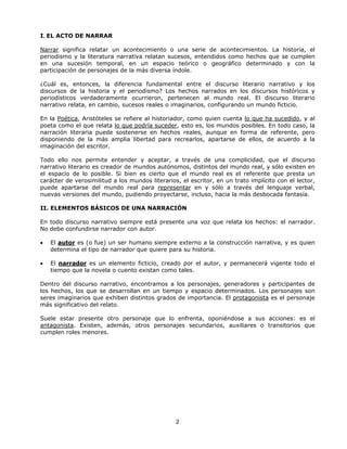 El documento proporciona una introducción al género narrativo. Explica que la narrativa implica relatar eventos en un orden temporal y espacial. Distingue entre narrativa histórica y periodística, que describen eventos reales, versus narrativa literaria, que puede incluir eventos reales o ficticios. Luego describe elementos básicos de una narrativa como el narrador, personajes, tiempo y espacio. Finalmente, resume algunas formas narrativas orales e incluye ejemplos como el mito, la leyenda, la epopeya y