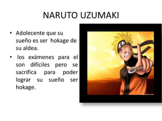 El documento resume la historia de Naruto, una serie manga escrita por Masashi Kishimoto que sigue la historia de Naruto Uzumaki, un ninja adolescente que aspira a convertirse en Hokage para ser reconocido en su aldea. También presenta a otros personajes principales como Sasuke Uchiha, Sakura Haruno, Kakashi Hatake y Gaara.
