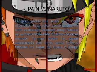 Naruto finalmente se enfrenta a Pain en una gran pelea que causó sensación en todo el mundo shonen. Aunque Pain es extremadamente poderoso, Naruto ha crecido más fuerte desde su último enfrentamiento, habiendo desarrollado el Modo Chakra que aumenta su velocidad y poder. A pesar de los múltiples cuerpos de Pain, Naruto demuestra ser el más fuerte y finalmente prevalece sobre Pain.
