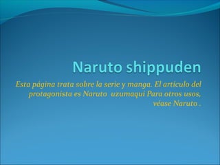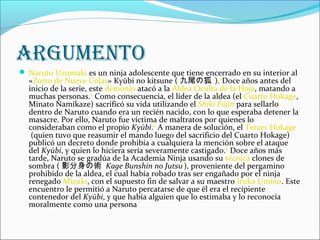 Este documento trata sobre la serie y manga Naruto. Naruto Uzumaki es un adolescente ninja que encierra al demonio de nueve colas dentro de él. La serie sigue las aventuras de Naruto y sus compañeros de equipo Sasuke y Sakura mientras se entrenan para convertirse en ninjas. El manga Naruto ha sido publicado semanalmente desde 1999 y ha sido recopilado en 51 volúmenes.