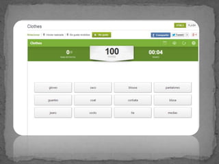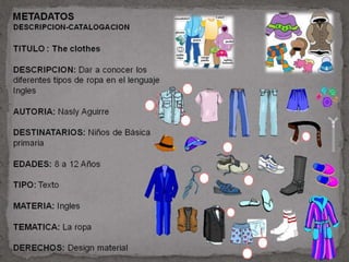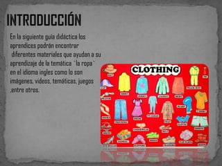 La guía didáctica enseña el vocabulario de la ropa en inglés a los estudiantes. Incluye imágenes, videos, juegos y otras actividades para ayudar a los estudiantes a aprender y practicar palabras relacionadas con la ropa. Los estudiantes aprenderán a reconocer y usar el vocabulario de la ropa en inglés en su vida diaria y clasificar diferentes tipos de prendas a través de aprendizaje virtual y físico.