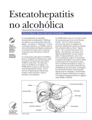 La esteatohepatitis no alcohólica (NASH) es una enfermedad del hígado común caracterizada por la acumulación de grasa en el hígado con inflamación y daño. Afecta principalmente a personas obesas o con sobrepeso de mediana edad y puede progresar a cirrosis hepática. No tiene un tratamiento específico, pero la pérdida de peso, dieta balanceada y actividad física pueden mejorar la condición. Se requiere una biopsia hepática para diagnosticar la NASH.