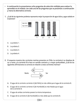 Este documento presenta una evaluación sobre ciencias de la Tierra y el universo para estudiantes de quinto año básico. Consiste en 8 preguntas de selección múltiple y 2 preguntas abiertas sobre temas como la distribución del agua en el planeta, corrientes oceánicas, ciclo del agua, y formas de ahorrar agua. El objetivo es evaluar los conceptos clave aprendidos en el módulo sobre estos temas.