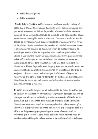 La natación es el movimiento a través del agua usando las extremidades sin instrumentos. Es un deporte aeróbico útil para el baño, buceo, pesca y salvamento. Tiene cuatro estilos principales: crol, espalda, braza y mariposa. Michael Phelps es el deportista olímpico más condecorado de todos los tiempos con 22 medallas, incluyendo 18 de oro, y múltiples récords mundiales en natación.