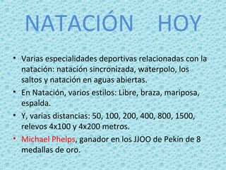 Este documento resume los principales aspectos de la natación olímpica. Explica las diferentes especialidades como natación sincronizada y waterpolo, y los estilos y distancias en natación individual. También describe los elementos de una piscina olímpica reglamentaria y los principios básicos de la flotación y la respiración en natación.