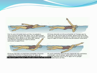 La natación requiere aprender habilidades motrices para sostenerse y avanzar en el agua usando brazos y piernas. Existen cuatro estilos reconocidos - crol, espalda, braza y mariposa - cada uno con una secuencia distintiva de movimientos de brazos, piernas y respiración. La natación puede practicarse con fines recreativos o deportivos en cualquier cuerpo de agua adecuado.