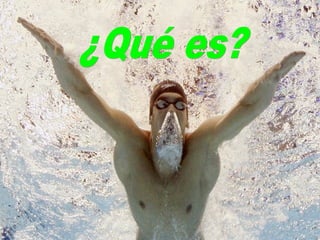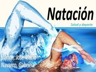 El documento describe la natación, incluyendo que es un deporte accesible para la mayoría de personas, los beneficios para la salud del sistema cardiovascular, respiratorio, muscular y nervioso, y los diferentes estilos, técnicas y equipamiento involucrados en la natación. Explica que la natación mejora la salud al fortalecer los músculos y dar flexibilidad a los pulmones.