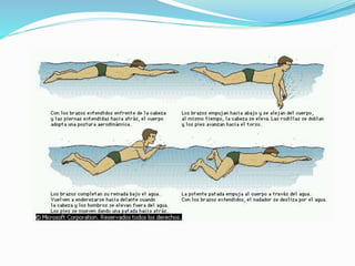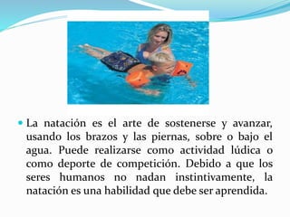 La natación requiere aprender habilidades para sostenerse y avanzar en el agua usando brazos y piernas. Existen cuatro estilos reconocidos - crol, espalda, pecho y mariposa - cada uno con movimientos específicos de brazos y piernas. La natación puede practicarse en diversos tipos de agua siempre que sea segura y permita el movimiento.