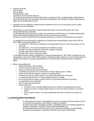 Este documento describe la natación paralímpica. Explica que combina diferentes tipos de discapacidades y se clasifica según la capacidad de nadar independientemente de la causa. Se convirtió en deporte paralímpico en 1960 y sigue las mismas reglas que la natación olímpica con algunas adaptaciones. Usa un sistema de clasificación funcional para agrupar nadadores por aptitudes similares en clases como S1-S10 para discapacidad física y S11-S13 para discapacidad visual.