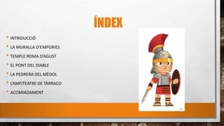 Este documento presenta información sobre varios monumentos romanos en Cataluña, incluyendo la muralla de Empúries del siglo I a.C., el templo romano de Augusto en Barcelona del siglo II d.C., el puente del Diablo de origen romano entre Martorell y Castellbisbal, la cantera de piedra de Mèdol cerca de Tarragona, y el anfiteatro de Tarragona. El documento introduce estos monumentos y proporciona breves descripciones de cada uno, destacando detalles como los materiales de construcción y las func