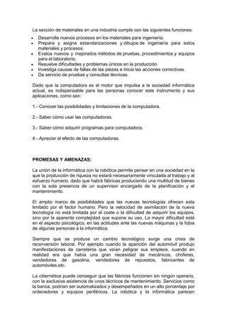 La robótica y la informática han mejorado los procesos industriales al automatizar tareas y aumentar la productividad. Si bien esto podría reducir la necesidad de mano de obra, en realidad crea nuevas demandas para técnicos especializados en diseñar, programar y mantener la tecnología. Aunque hay desafíos en la adaptación al cambio tecnológico, las empresas que lo adopten tendrán ventajas de competitividad.
