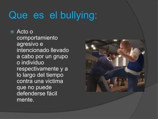 El documento describe el cyberbullying, sus formas y efectos en las víctimas. Explica que el cyberbullying es un tipo de acoso verbal y escrito que ocurre a través de las tecnologías y que puede afectar la autoestima y salud mental de las víctimas. También destaca las diferencias entre el bullying tradicional y el cyberbullying, como la amplitud de la audiencia, el anonimato del acosador y la permanencia del contenido digital. Finalmente, enumera siete categorías comunes de cyberbullying.