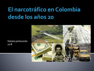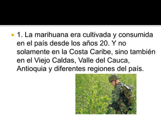 El documento resume la historia del cultivo y consumo de marihuana en Colombia desde los años 20, y cómo el narcotráfico se desarrolló paralelamente a la economía legal del país. También discute cómo el negocio de las drogas se expandió desde Bogotá a otras regiones en las décadas de 1960 y 1970, y cómo la presión estadounidense llevó a una mayor desestabilización del país.