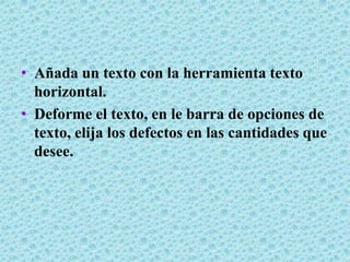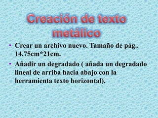 El documento proporciona instrucciones para crear un logotipo metálico con texto deformado en varias etapas: 1) crear un archivo, añadir un degradado y texto; 2) deformar el texto y crear un trazado; 3) rellenar el trazado con color y añadir una sombra paralela; 4) añadir un degradado de superposición y un trazo final.