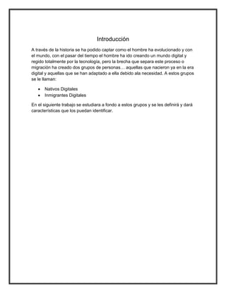 Nativos digitales son personas menores de 25 años que han crecido en la era digital y se sienten cómodos con la tecnología. Inmigrantes digitales son mayores de 30 años que tuvieron que adaptarse a un mundo digital, especialmente para trabajar. Los nativos son multitarea, prefieren lo visual y esperan respuestas rápidas, mientras que los inmigrantes se adaptaron al cambio tecnológico.