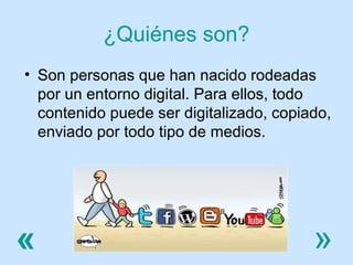 El documento describe a los nativos digitales como personas que han crecido en un entorno digital donde todo el contenido puede ser digitalizado y compartido fácilmente. Se caracterizan por tener una identidad digital importante en la red, ser capaces de trabajar de forma multitarea, dominar las herramientas digitales y ver el mundo como un espacio para crear y compartir contenido sin barreras. Para los nativos digitales, lo digital forma parte integral de su vida cotidiana.