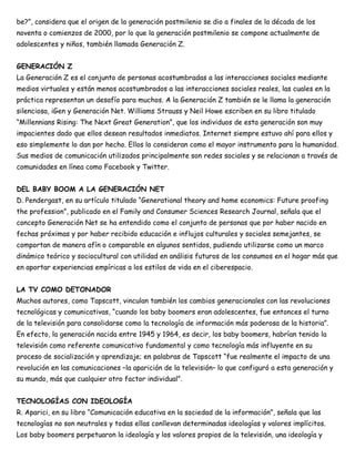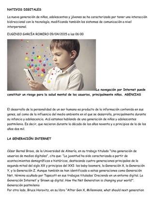 El documento analiza la generación de nativos digitales, compuesta por niños y adolescentes que han crecido con tecnología, destacando sus interacciones bidireccionales y sus características como usuarios. Se discuten los riesgos de la navegación en internet para la salud mental, así como los cambios en la comunicación e interactividad en comparación con generaciones anteriores. Se concluye con la necesidad de promover un internet seguro ante las amenazas que enfrentan los usuarios más jóvenes.