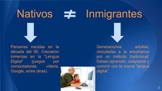 Este documento contrasta las diferencias entre nativos digitales (personas nacidas en la década de 1990 que crecieron inmersas en la tecnología) e inmigrantes digitales (generaciones adultas vinculadas a la enseñanza tradicional que deben aprender y adaptarse a la tecnología). Explica que los nativos digitales se sienten atraídos por las multitareas, el acceso al azar a la información y la conexión en línea, mientras que los inmigrantes digitales tienden a procesos secuenciales, un it