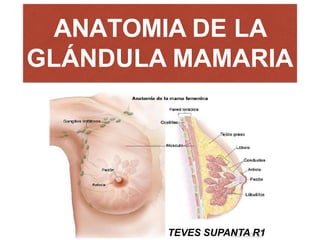 La glándula mamaria humana se origina del ectodermo y se desarrolla a partir de la 5° semana del embarazo, formando líneas mamarias que en su mayoría involucionan, dejando cuatro esbozos mamarios. Estructuralmente, las mamas consisten en tejido glandular, fibroso y graso, situadas sobre los músculos pectorales y conectadas a la piel por ligamentos suspensorios. Su irrigación proviene de varias arterias, mientras que el drenaje venoso y linfático se dirige principalmente hacia los nódulos axilares.