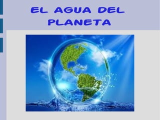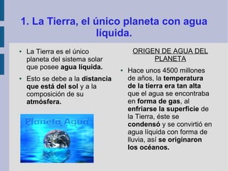 La Tierra es el único planeta en el sistema solar que tiene agua líquida, debido a su distancia al sol y composición atmosférica. El agua se originó hace 4500 millones de años cuando la superficie se enfrió y el vapor de agua se condensó para formar océanos. La mayoría del agua de la Tierra está en los océanos, que son salados con una salinidad media de 35 gramos por litro compuesta principalmente de cloruro de sodio. El agua se mueve continuamente a través del ciclo del agua entre los
